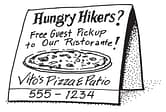 As the “Appalachian Trail” passes through Franklin, NC, distance hikers often check into local hotels for a hot shower and soft bed. Recognizing potential guests without wheels, Vito LoMonaco places laminated flyers in area inns, describing his pizzeria and offering “Free Guest Pickup and Drop Off to Local Hotels.” As a result, a growing number of hikers are coming to enjoy a hot, hearty Italian meal before continuing on their way. And word of mouth is spreading up the trail that Vito’s is hiker friendly!